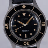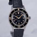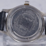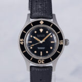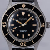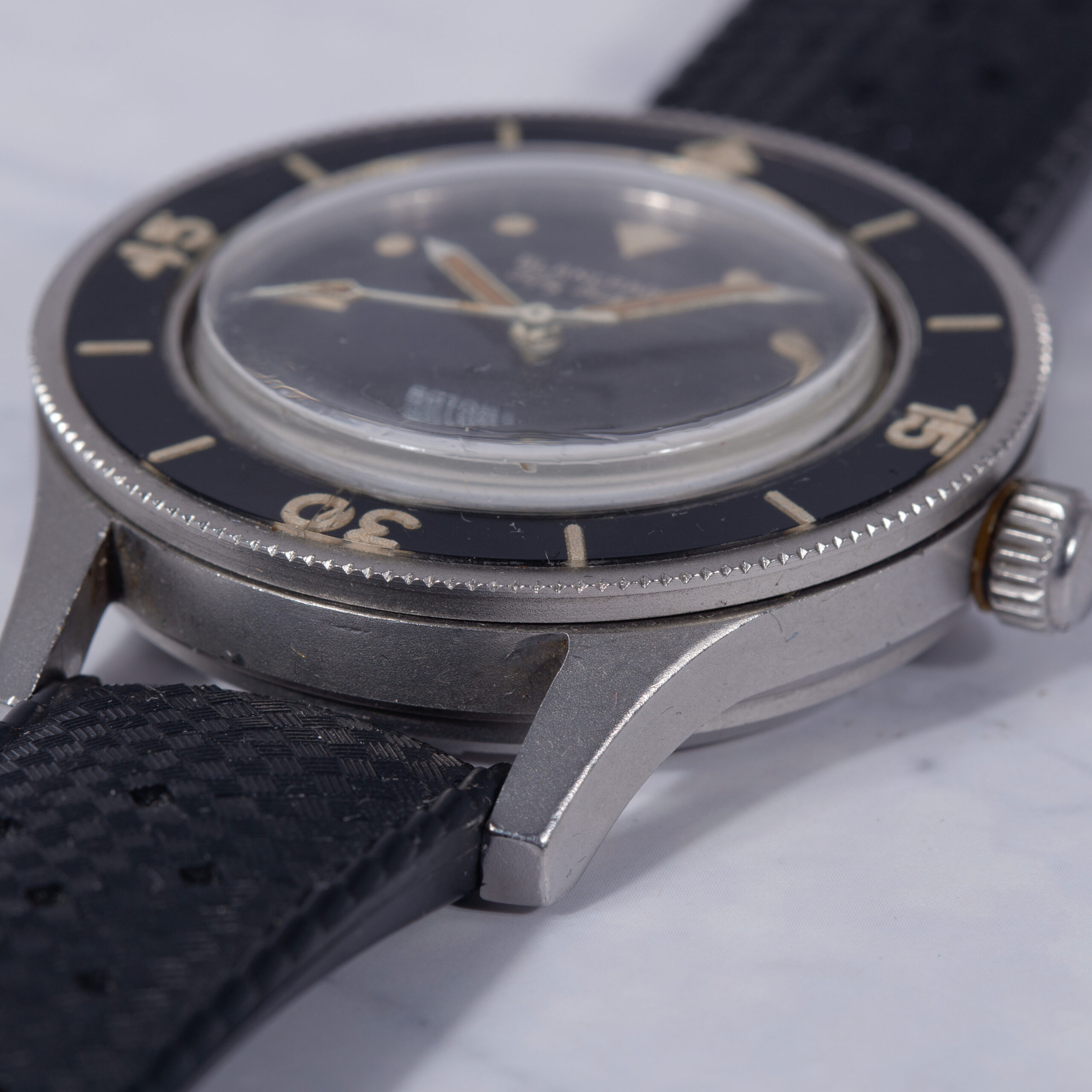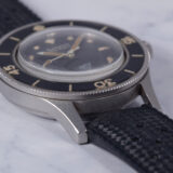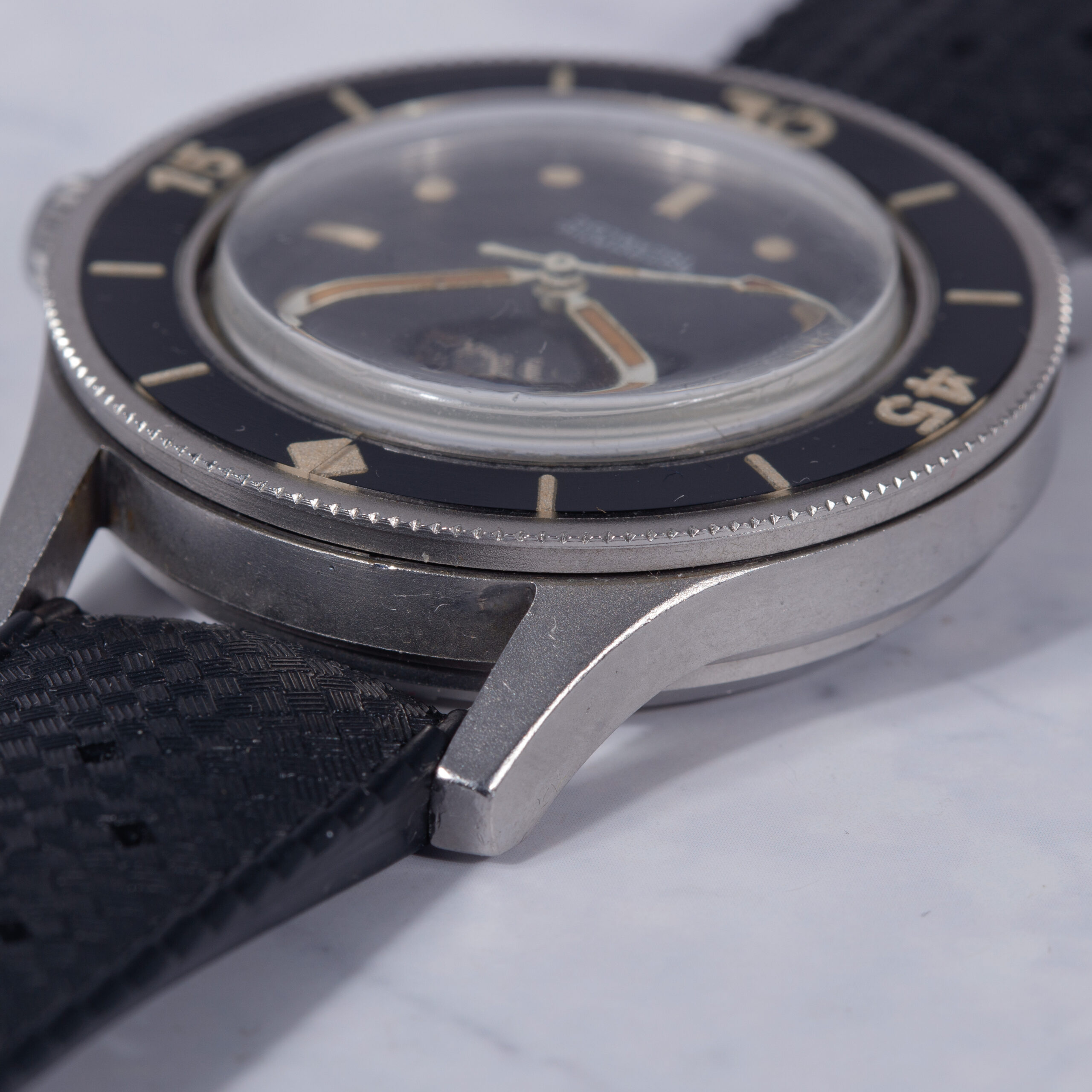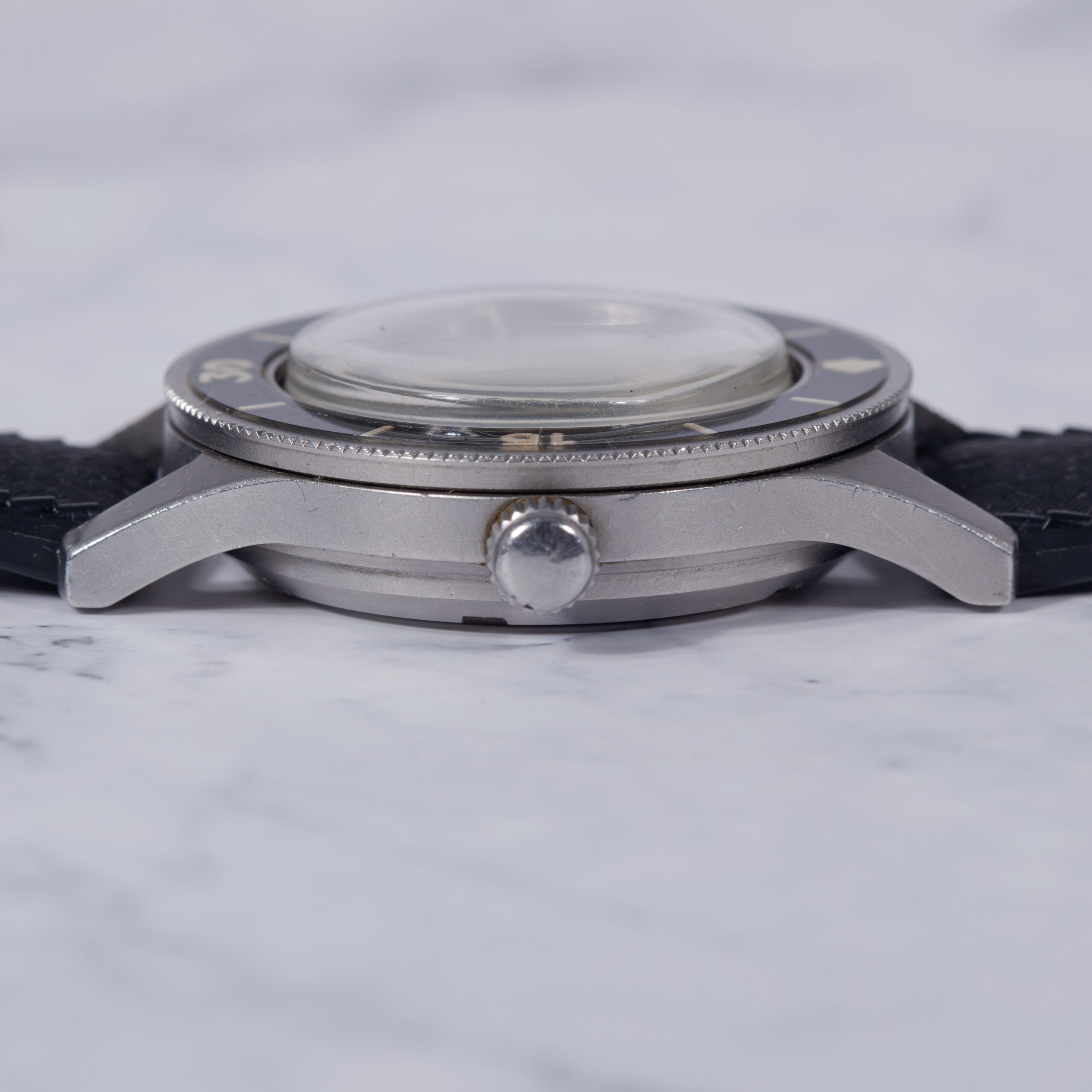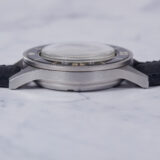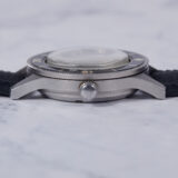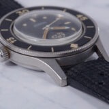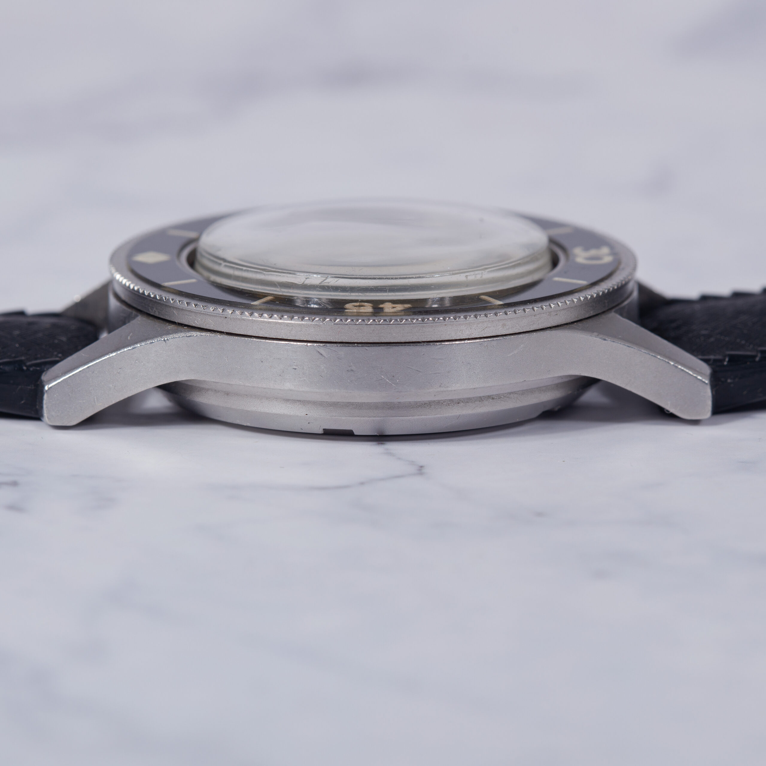 Boîte : Boîtier acier en état exceptionnel, angles francs et satinage d’origine parfaitement conservé. Aucune trace de polissage excessif. Lunette bakélite d’origine, graduée 60 minutes, encore éclatante avec index radium d’époque. Couronne signée, parfaitement fonctionnelle. L’ensemble présente une patine naturelle magnifique, d’une cohérence rare pour une montre de plongée de cette époque.