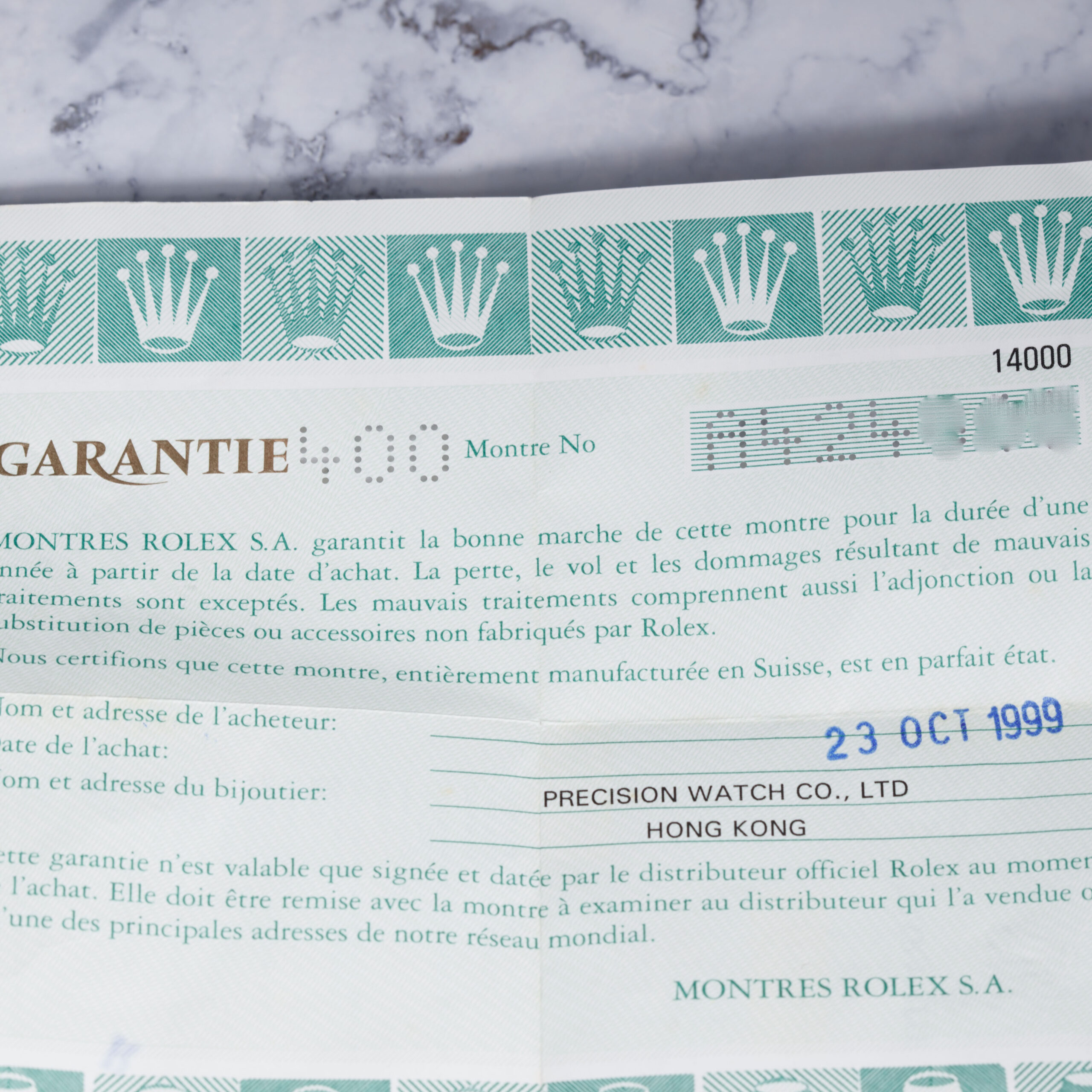 Accessoires : Livrée full set avec boîte Rolex d’origine et papiers de garantie d’origine datés du 23 octobre 1999, ainsi que les documents et accessoires d’époque.