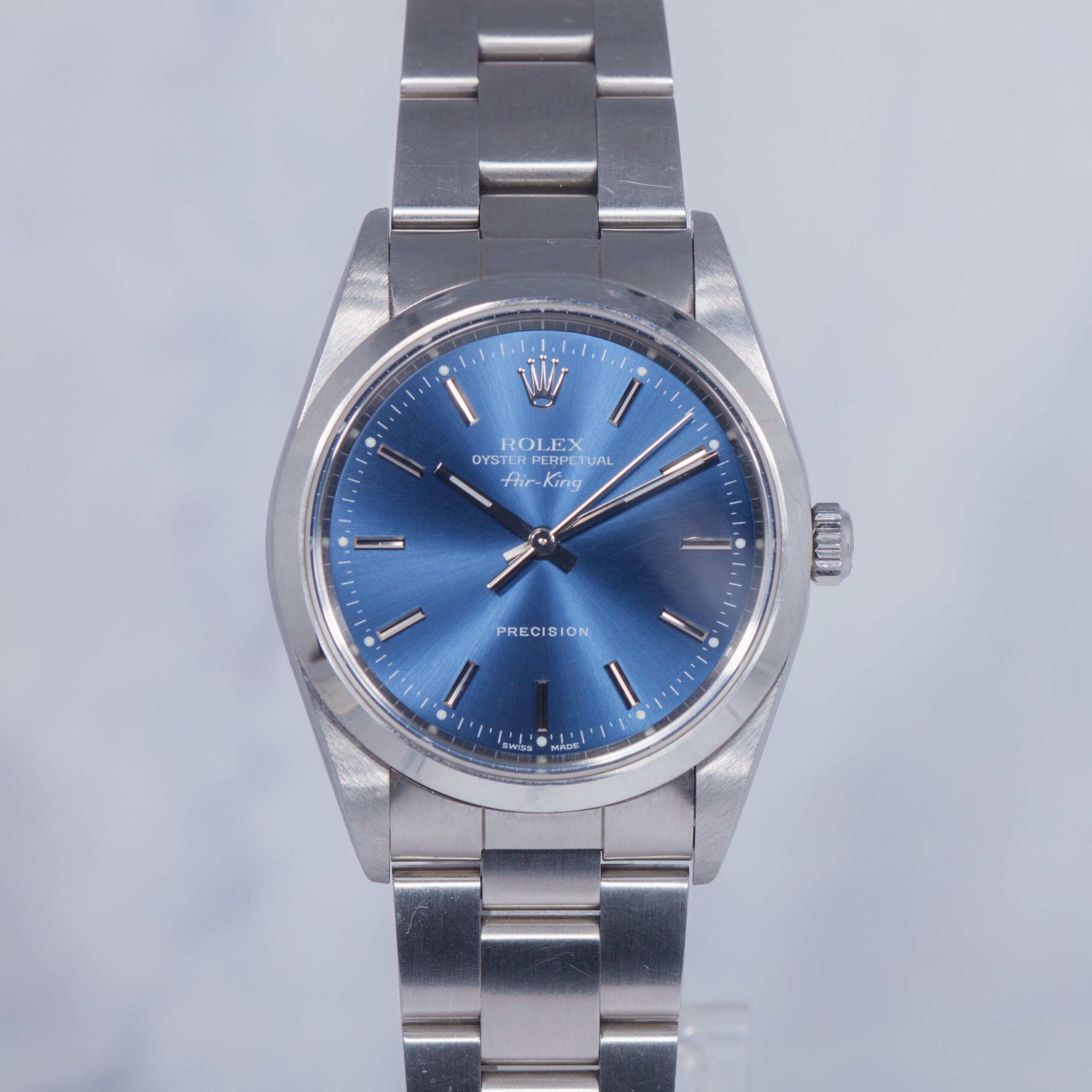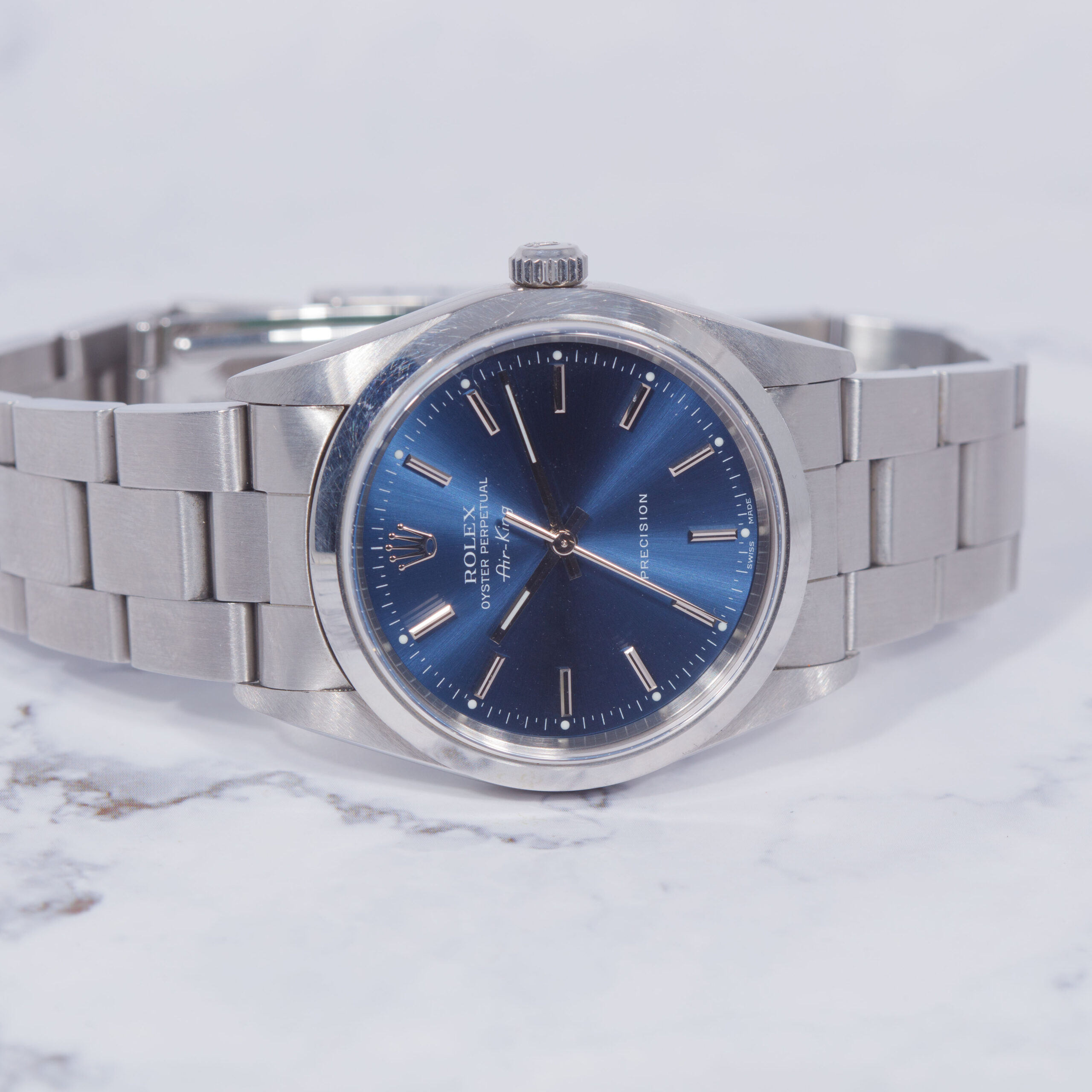 Cadran : Magnifique cadran bleu soleil d’origine Rolex offrant de superbes reflets selon la lumière. Le cadran est en état irréprochable, sans défaut, avec index appliqués et aiguilles parfaitement conservés. Mention « Precision » caractéristique des Air-King de cette génération.