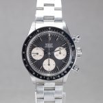 Notre avis : Le modèle de Rolex Cosmograph Daytona est un chronographe de sport lancé en 1963 par la société Rolex SA. Le Cosmograph Daytona fait partie de la catégorie de montres professionnelles au sein de la gamme Rolex. Il a été conçu à l’origine pour les pilotes de course. Quatre générations de Daytona ont vu le jour respectivement en 1963, 1988, 2000 et 2016. La première était dotée d’un mouvement à remontage manuel, la deuxième d’un mouvement à remontage automatique et la troisième et quatrième d’un mouvement manufacture Rolex. Le record du monde en vente aux enchères est une Rolex Daytona ayant appartenu à Paul Newman et vendue chez Philips a NYC pour 17,75 millions de dollars en 2017. L’original est donc la version à 4 chiffres dont fait partie celle-ci. La nôtre est en parfait état de conservation peu polie avec un cadran ou les compteurs sont encore bien blancs car souvent noircis par le temps et les points de tritium ont une superbe patine.