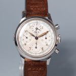 Our opinion: Les chronographes Aerocompax ont été principalement produits par Universal Genève et les versions étanches comme celui-ci sont très recherchés et la production à l’époque était assez faible comparé aux autres chrono, surtout dans le boîtier étanche avec des poussoirs ronds. C’est d’autant plus rare qu’il a été réalisé par Girard Perrégaux un seul vu dans cette configuration. La base du calibre est très proche de celle utilisée par Universal à l’époque, le calibre 285 avec la fonction mémo à 12 heures. Grand diamètre de 37 mm pour l’époque et cadran bicolore avec 4 compteurs ainsi qu’une très belle patine. Montre rare en version acier étanche et de la marque Girard Perrégaux.
