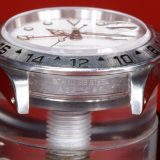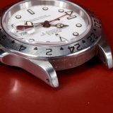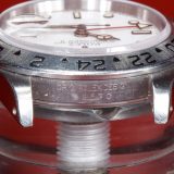 Bezel: Belle lunette avec tous ses marquages noirs encore bien présents une lunette graduée de 2 à 24 assez unique servant à indiquer une lecture de l’heure sur 24H grâce à sa son aiguille rouge GMT. Celle-ci indique l’heure en ne tournant qu’une fois en 24h. Cette aiguille était utilisée par les explorateurs qui pouvaient rester plusieurs jours dans des cavernes sans lumière naturelle et avait donc le besoin d’avoir une indication spécifique afin de déterminer s’il est 8 h du matin ou du soir par exemple. De ce fait cette lunette est non directionnelle et fixe.